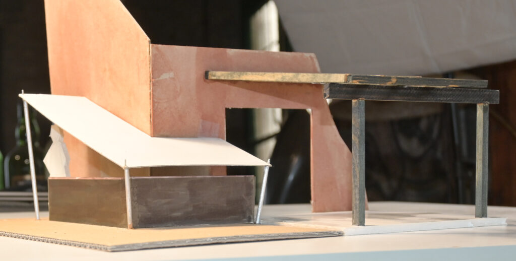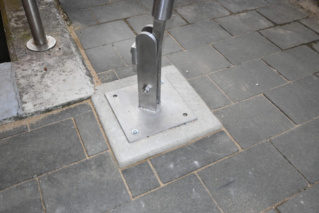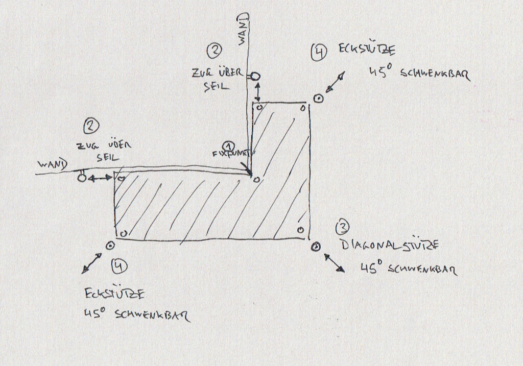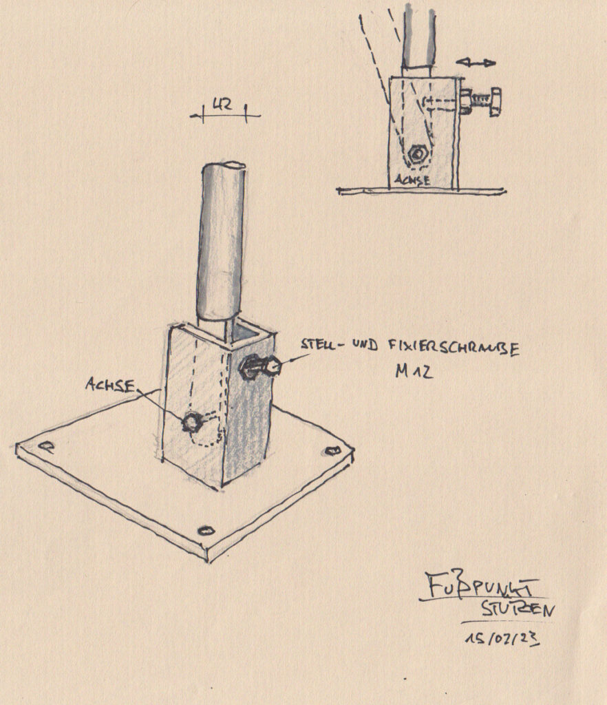 Um keine Seile in den Durchgang spannen zu müssen, soll das Segel durch schwenk- und fixierbare Stützen gespannt werden.