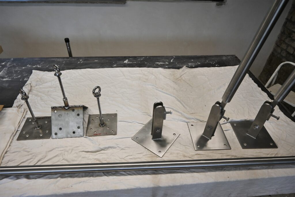Stützen und  Wandauflager provisorisch montiert und auf die spätere Spannposition ausgerichtet und fixiert,