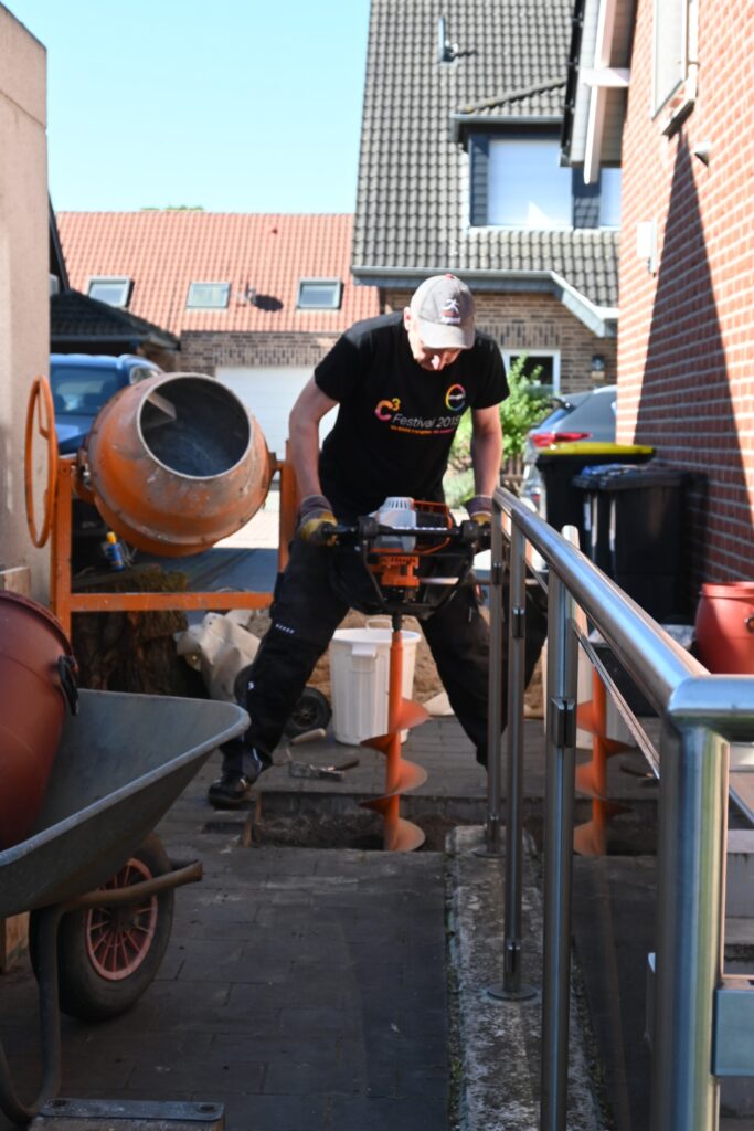 Bohren der Löcher (der Bauherr gibt Alles!), Einbringen der vorgefertigten Schalung, Betonieren