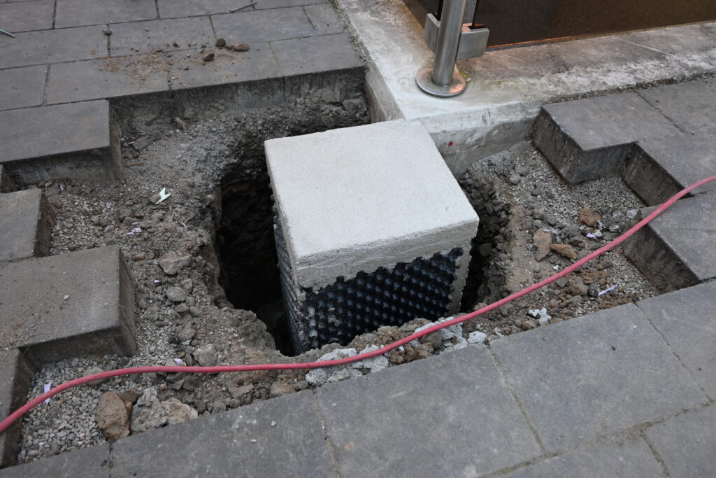 Die vorher in die Schalung eingebrachte Noppenbahn schützt nicht nur den Beton vor kapillarer Feuchtigkeit aus dem Erdreich, sie erleichtert auch ungemein das Ausschalen im engen Erdloch. Die Oberfläche des Fundamentes wird vor Einbau der Stützen noch mit Beton-Abdichtung wasserdicht gemacht.