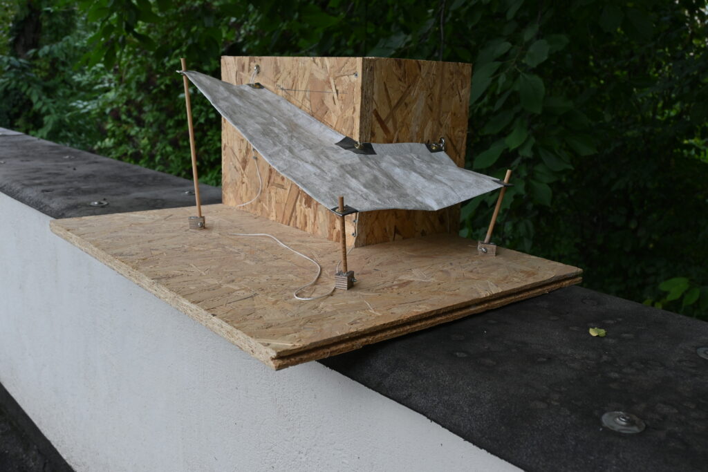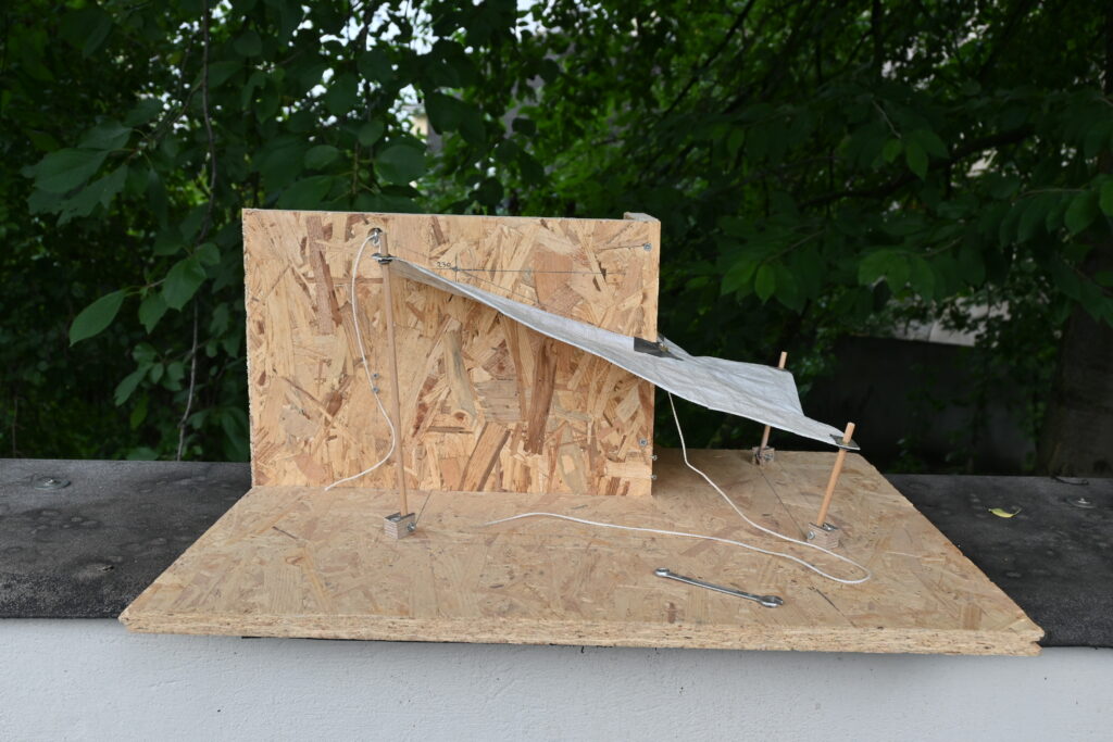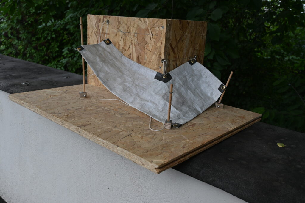 Das "Segel" wird mittels Seilen an den Wandbefestigungen "gehisst" und dann mittels Schwenken der "Masten" gespannt.