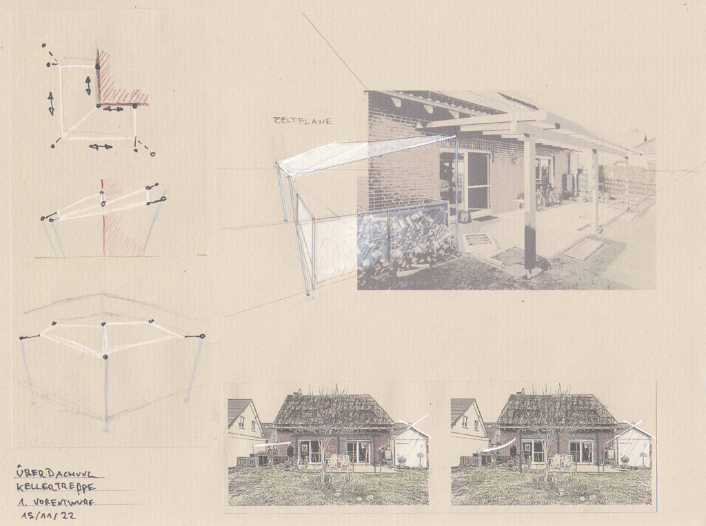Entwurf und Bau einer Außentreppen-Überdachung in Segel-Konstruktion (in Arbeit)