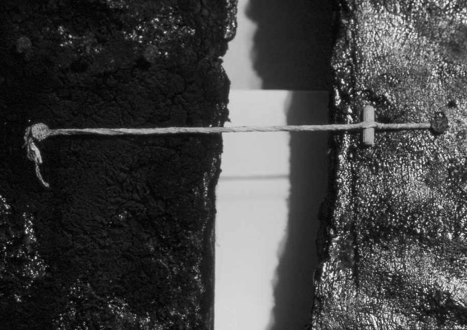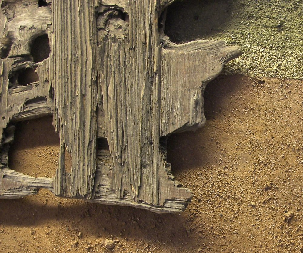 Geteerte Dachplanken aus Abriss, auf Kalk-Feinputz-Tafeln platziert,