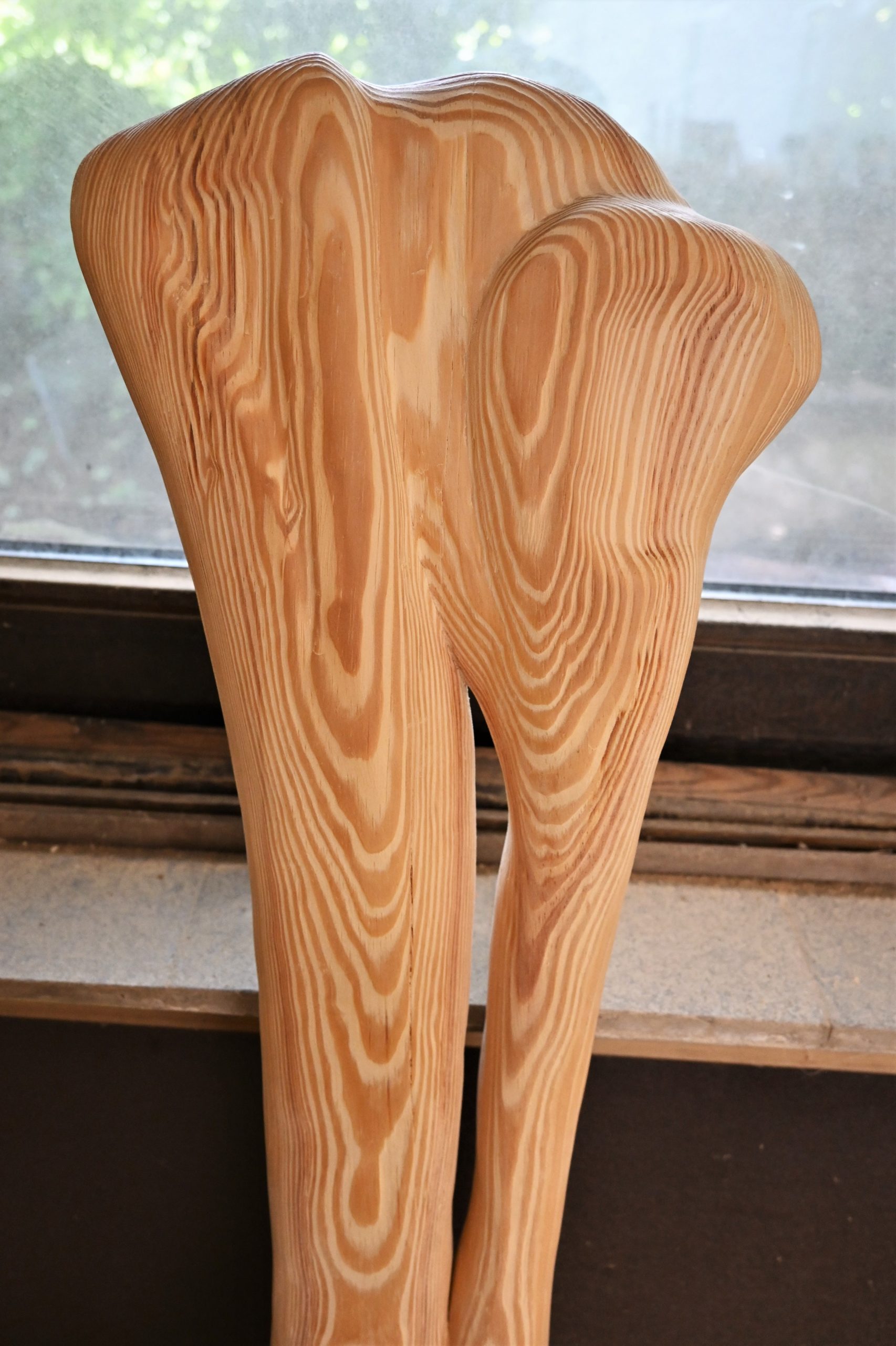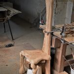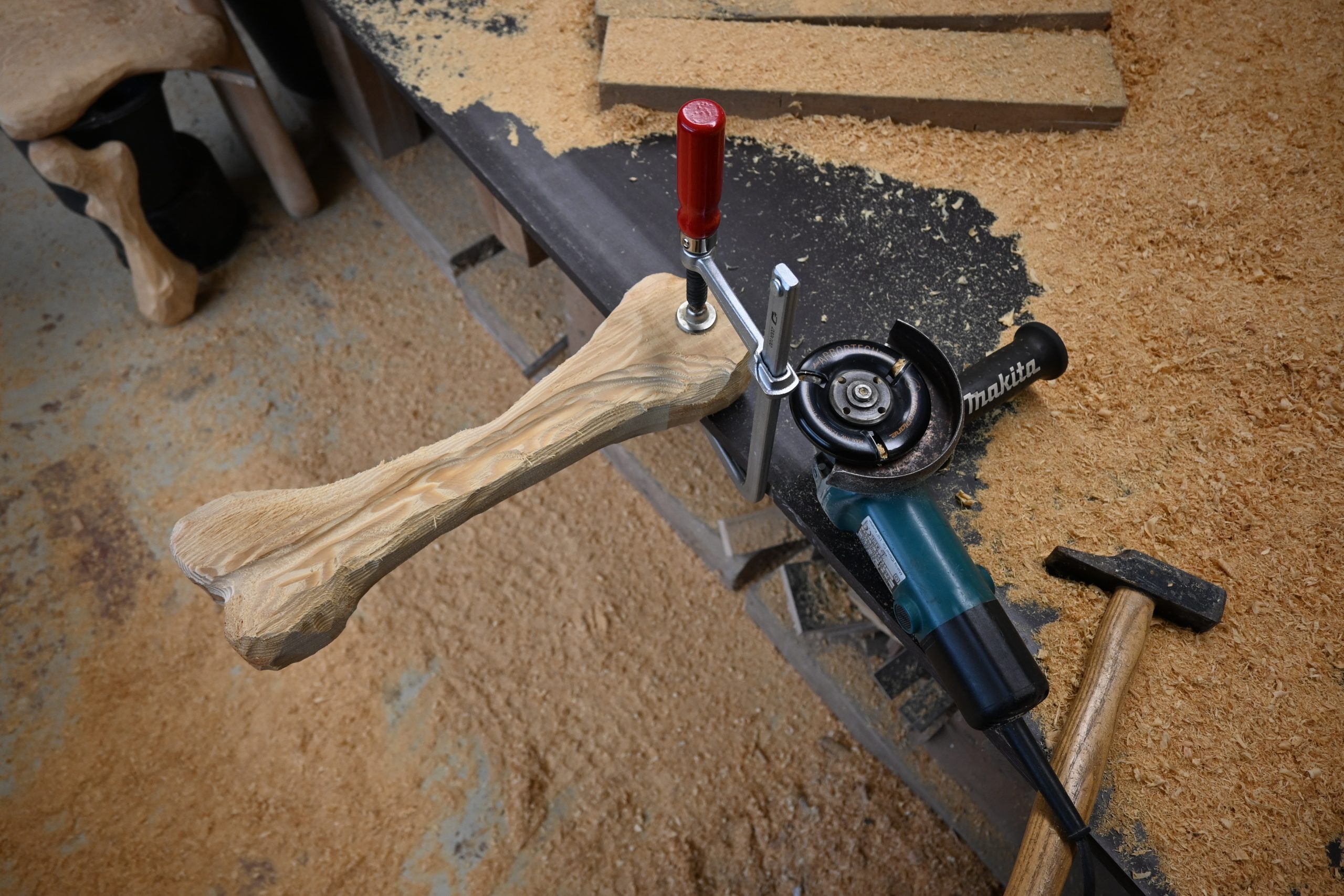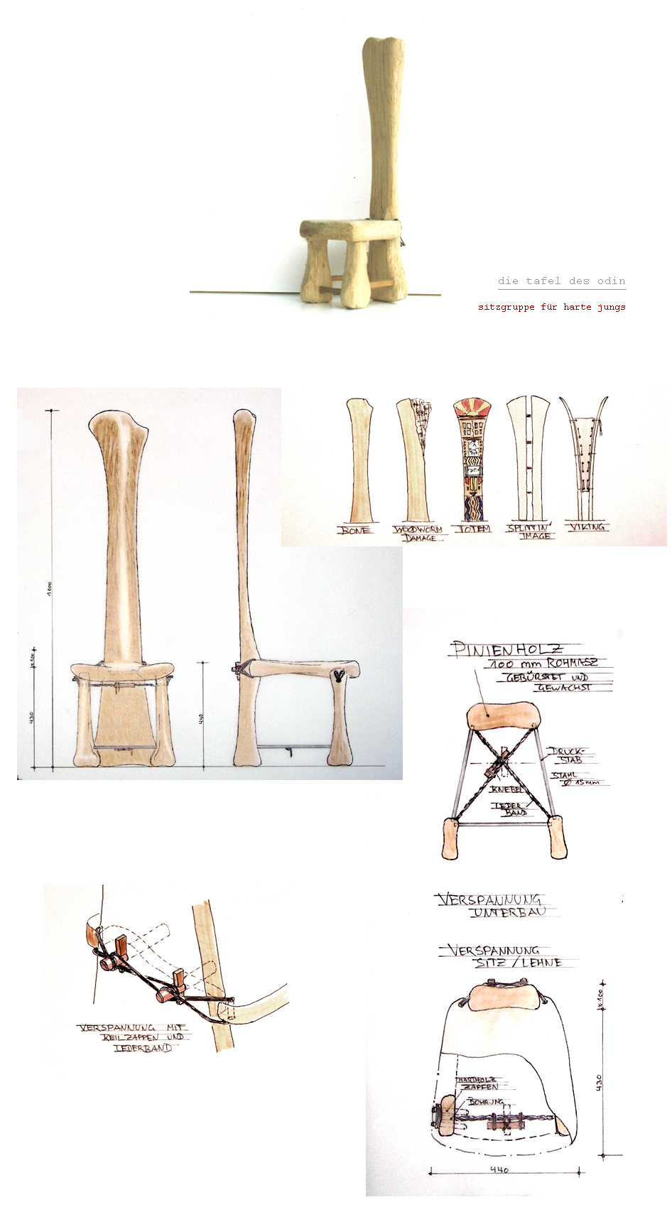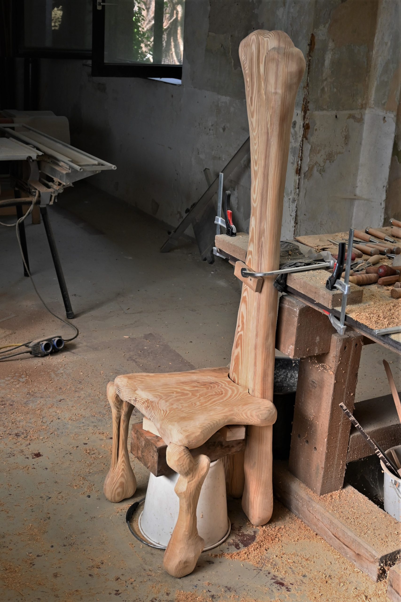 Bau des ersten Stuhles – "Bone Chair" Derzeit in Arbeit –Galerie wird weitergführt Inspiration Grobes Erarbeiten der Form Bildhauen mit der Flex Pinienholz, Feinschliff und gebürstet Loses Zusammenfügen der Teile Ausarbeiten der "Gelenke" Ausarbeiten der "Gelenke"