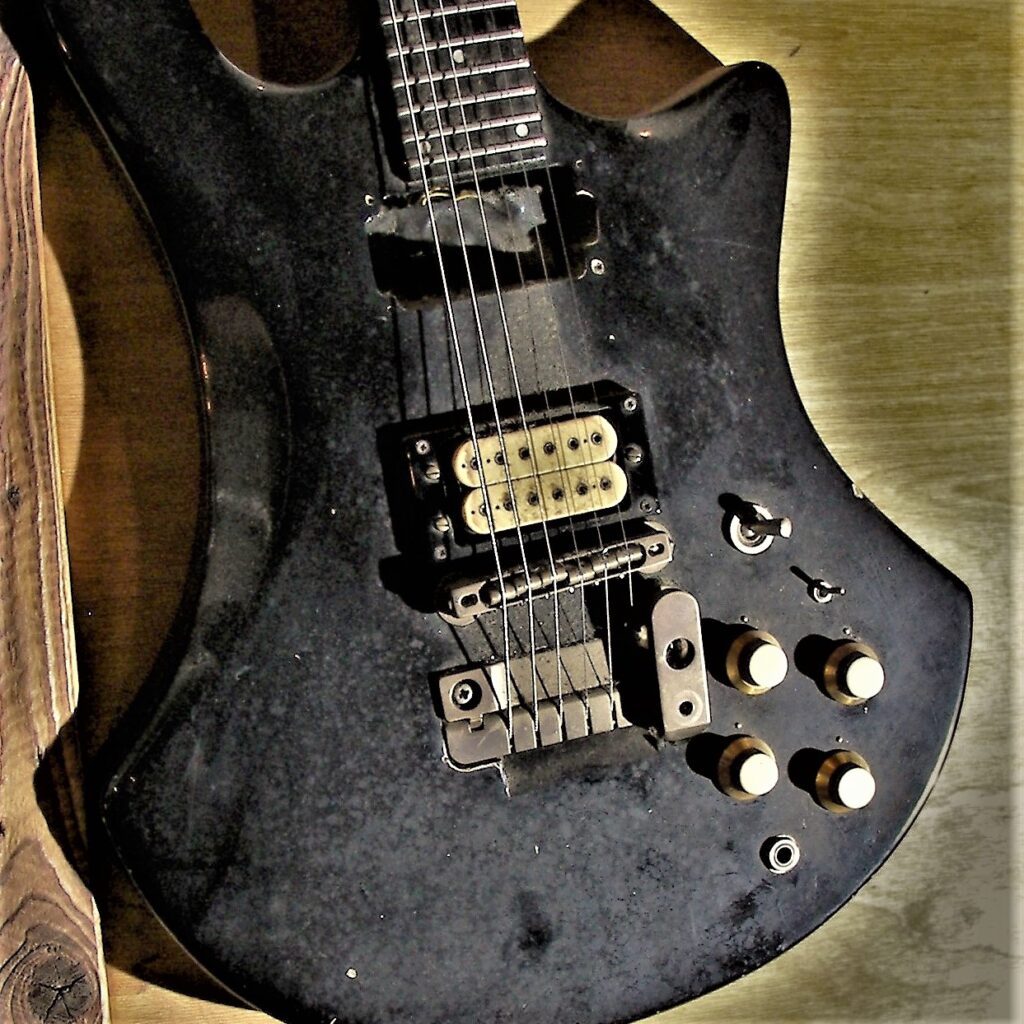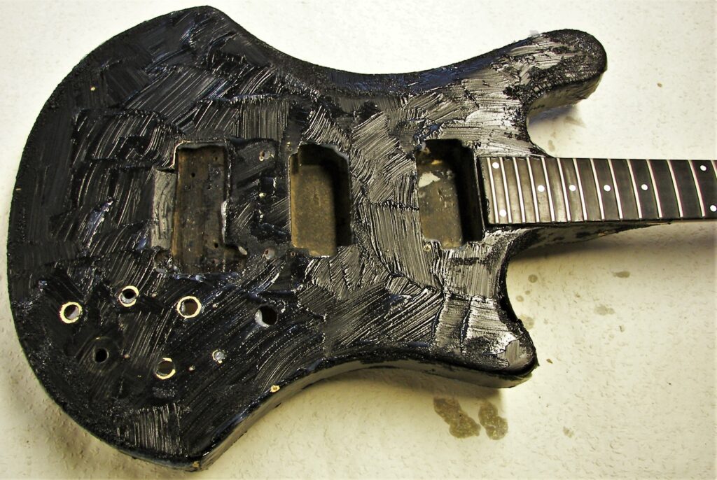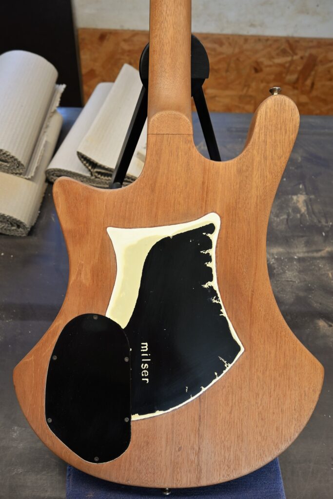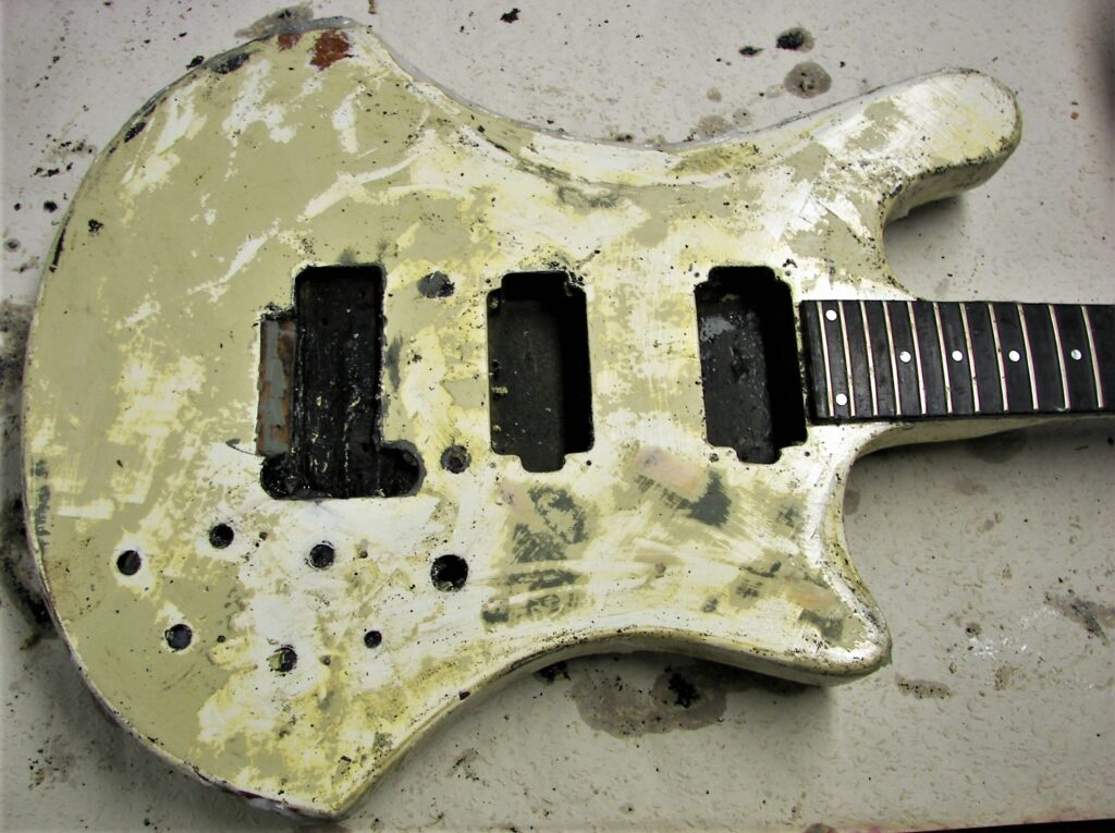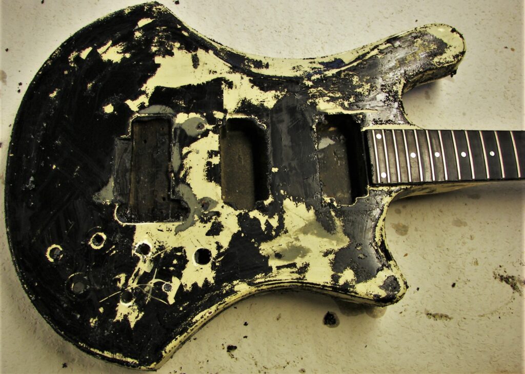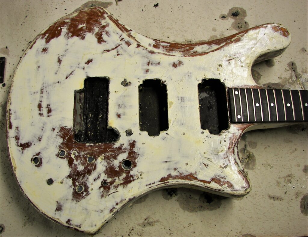 Als Reminiszenz an 45 Jahre Bühne und Proberaum, Jugend und Partys habe ich auf der Rückseite die Schichten der alten Lackierungen herausgearbeitet (original weiß, dann nikotinisiert, dann gespachtelt und schwarz umlackiert, am Ende abgerockt) und mit Klarlack konserviert.
