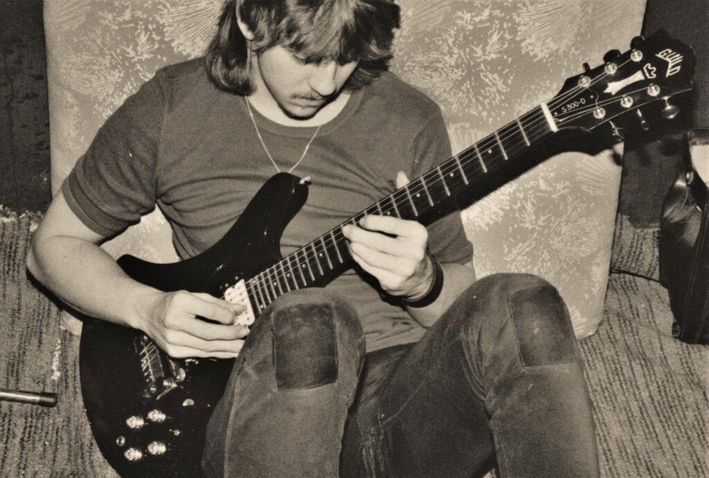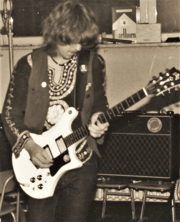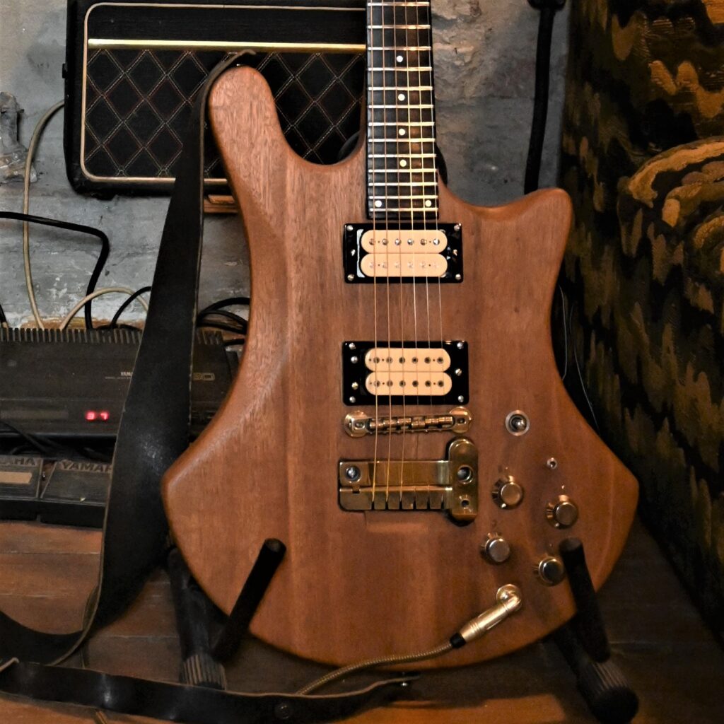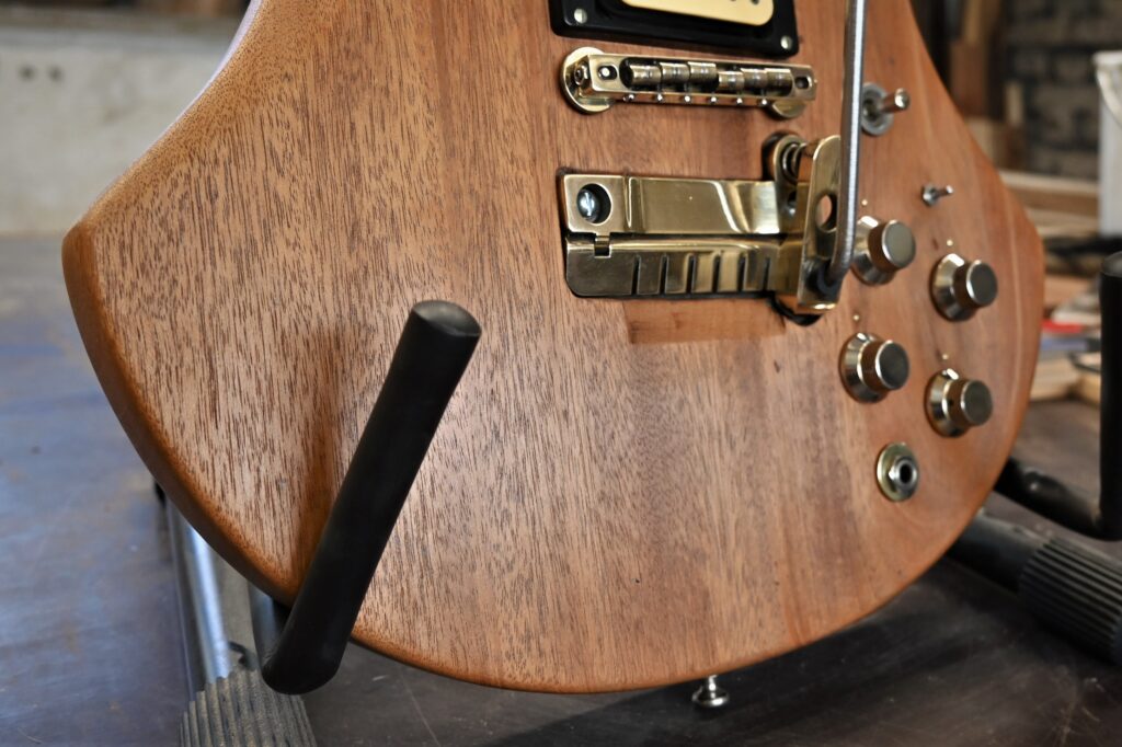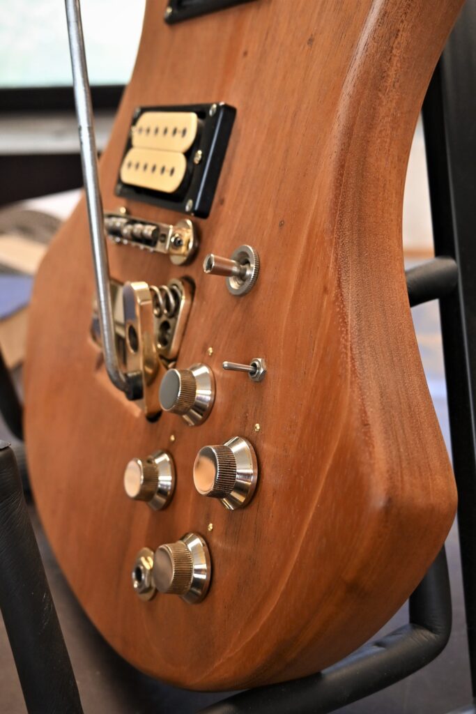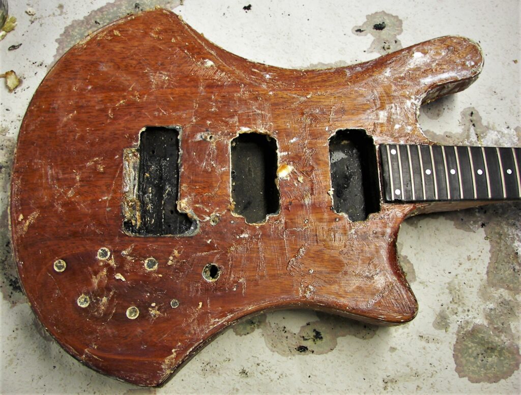 Als Reminiszenz an 45 Jahre Bühne und Proberaum, Jugend und Partys habe ich auf der Rückseite die Schichten der alten Lackierungen herausgearbeitet (original weiß, dann nikotinisiert, dann gespachtelt und schwarz umlackiert, am Ende abgerockt) und mit Klarlack konserviert.