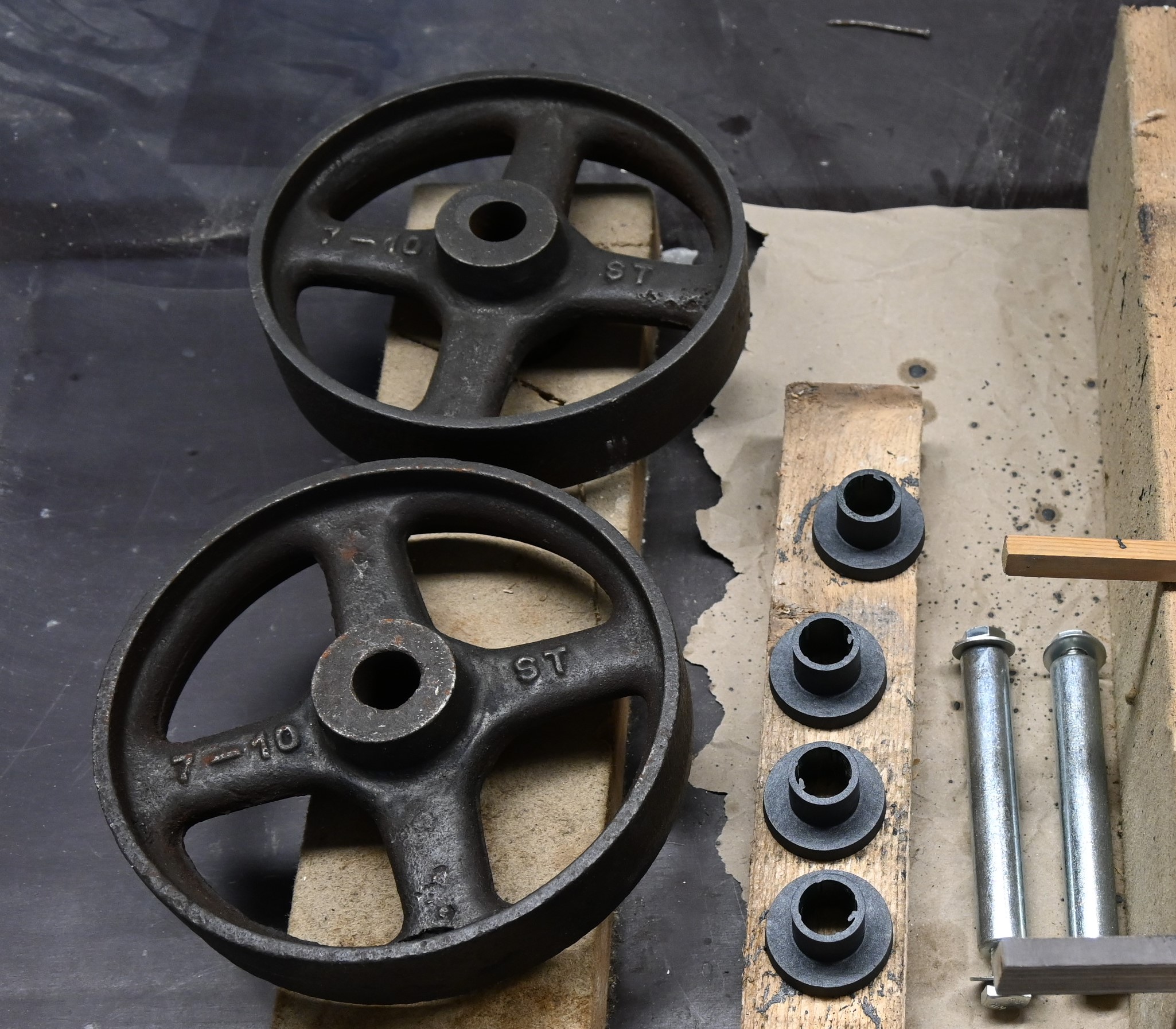 Siebdruckplatten-Resten, historischen Maschinenrädern, Gussrohren aus Rückbau