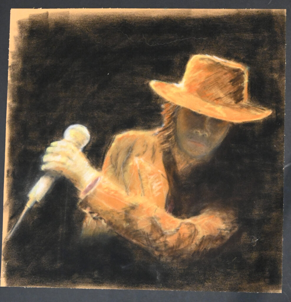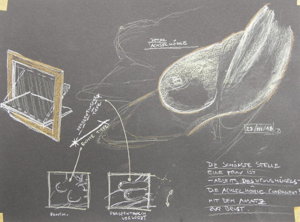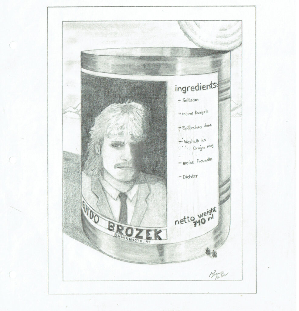 Leute Portraits, Photographie (-bearbeitung), Schnellskizzen (meist in Kneipen) Diese Seite ist noch unvollständig und in Arbeit.Bin dabei! Stand: 14-Jan-2025 'Basia'Portraitstudie (2021), weißer Buntstift auf schwarzem Karton ca. DIN A4,(analoge) Photographie (Agfa Scala s/w Dia-Film,digital bearbeitet)Entwurfszeichnungen, skulpturaler Entwurf, usw. 'Guido'(ca. 1994) Bleistiftzeichnung alsDruckvorlage fürLiteraturmagazin 'Lindenberg' (ca. 1990) Pastellkreide auf orangefarbenemSpezialpapierca. 30 * 30 cm Das Gesicht sieht MIRähnlicher als Lindenberg. Sorry. Schnelle Sachen aus den Skizzenbüchern: