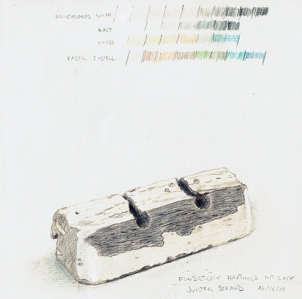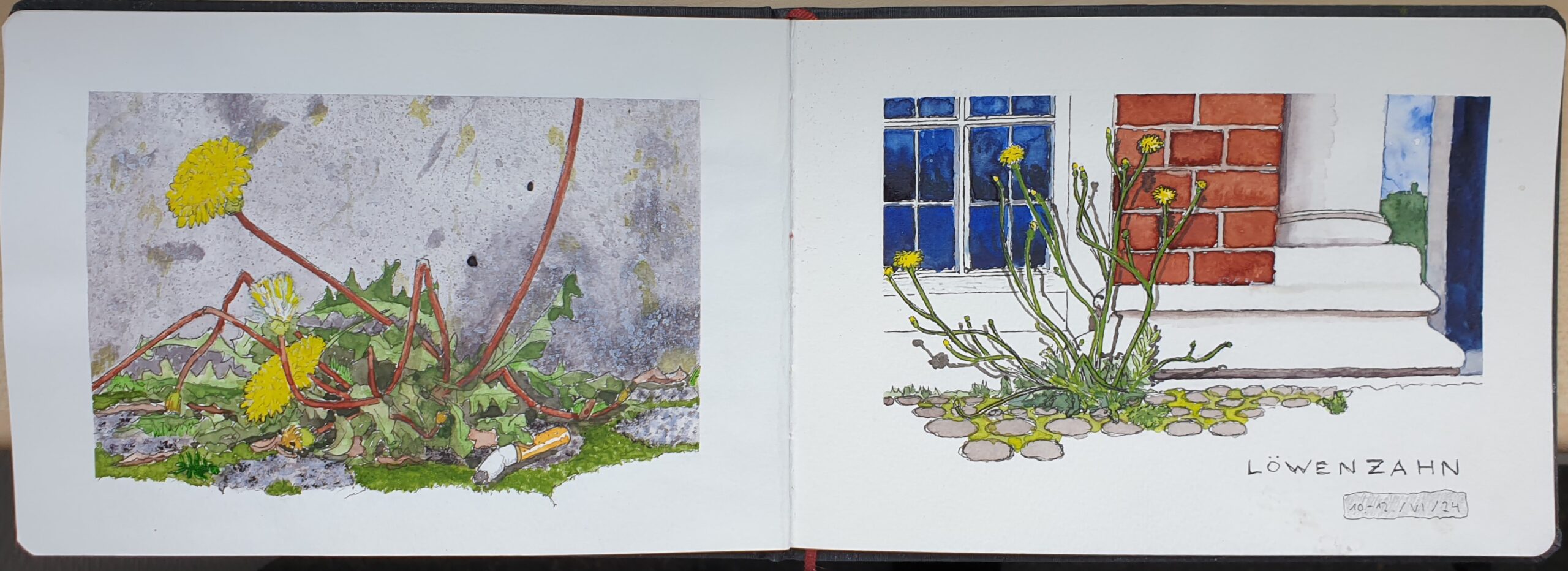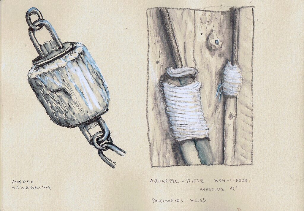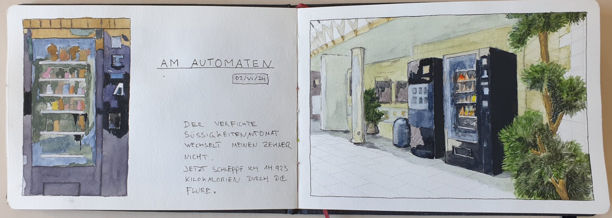 Skizzenbücher Reisetagebuch Fischland/DarßTitelbild (2022) Buntstift und AquarellSkizzenbuch ca. 15 * 21 (aufgeklappt 42) cm, Papier wasserfest cremefarben Reisetagebuch Fischland/DarßSchilfufer am Saaler Bodden (2022) Buntstift und AquarellSkizzenbuch ca. 15 * 21 (aufgeklappt 42) cm, Papier wasserfest cremefarben Reisetagebuch Fischland/Darß/ZingstKneipe 'Moby Dick' (2022) links: Buntstift und Tuscherechts: Tusche und Aqua-Pen, Aquarellstifte, weißer BuntstiftSkizzenbuch je ca. 21 *15 cm, Papier wasserfest cremefarben Seelenschiffchen, Musiker,Zeuthener See bei NachtTrauerfeier für Katrin (2021) Eingeklebte Photos,Zeichnung Tusche/Aqua-Pen,Monochromes Aquarell mit DeckweißSkizzenbuch ca. DIN A5 Duisburg-MeiderichGaststätte 'Posthorn – Der Grieche' (2021) Wasserfeste und -lösliche Tusche,Aqua-Pen, Buntstift, KassenzettelSkizzenbuch ca. DIN A5 Inner Klapse (2024)– Am Automaten – Wasserfeste Tusche, AquarellSkizzenbuch 15 * 21 (aufgeklappt 42) cm Inner Klapse (2024)– Löwenzahn – Wasserfeste Tusche, AquarellSkizzenbuch 15 * 21 (aufgeklappt 42) cm Inner Klapse (2024)– Container – Studien Wasserfeste Tusche, AquarellSkizzenbuch 15 * 21 (aufgeklappt 42) cm Inner Klapse (2024)– Tablett – Wasserfeste Tusche, Aquarell, eingeklebte Küchen-BonsSkizzenbuch 15 * 21 (aufgeklappt 42) cm Inner Klapse (2024)– Lecker Rauchen / 'Der Schnorrer' – Wasserfeste Tusche, Aquarell, wasserlösliche Tusche mit Aqua-PenSkizzenbuch 15 * 21 (aufgeklappt 42) cm Inner Klapse (2024)– Raucherpavillon – Wasserfeste Tusche, AquarellSkizzenbuch 15 * 21 (aufgeklappt 42) cm Juist (2010)– Fundstücke / Treibholz – BuntstiftSkizzenbuch ca. DIN A4 naturfarben